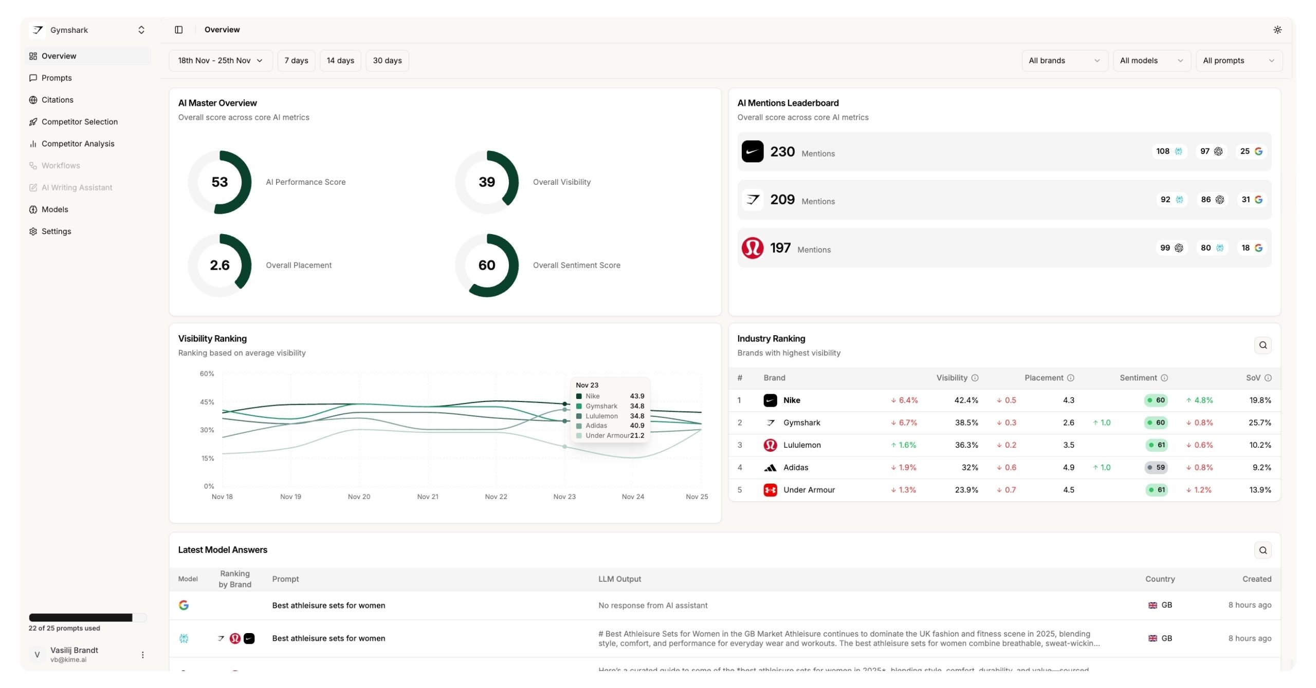 • KIME: Measures visibility in two distinct ways. Our AI Performance Score reflects how often your brand is mentioned, while our Share of Model shows how you stack up against competitors in the actual AI output. Kime’s dashboard includes comparative metrics that allow you to see how your visibility shifts week-over-week, providing the granular data needed to prove ROI to stakeholders.