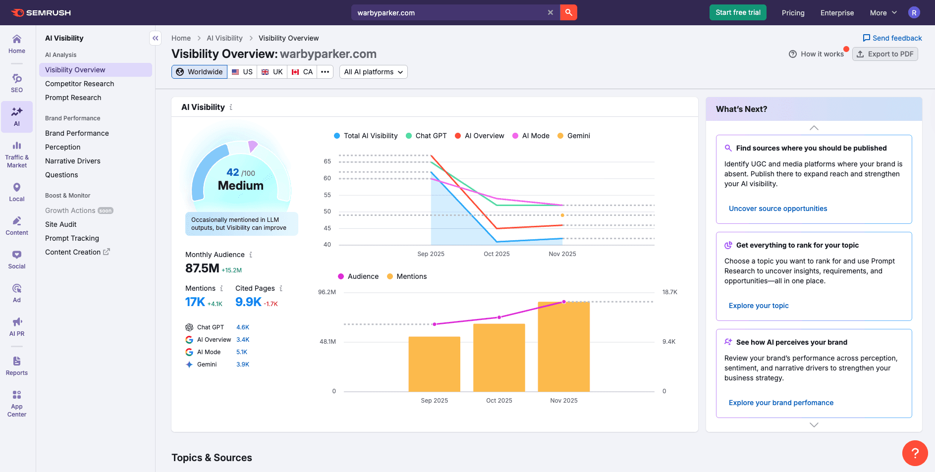 • Semrush: Offers a "Visibility Index" that tracks brand mentions across the web. While this gives you a basic idea of where your brand stands, it is often too simplistic for enterprise-level reporting. It tracks "mentions" like a PR tool from 2015, failing to distinguish between a casual name-drop and a high-authority citation that actually drives traffic.